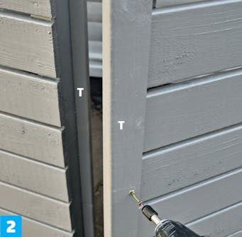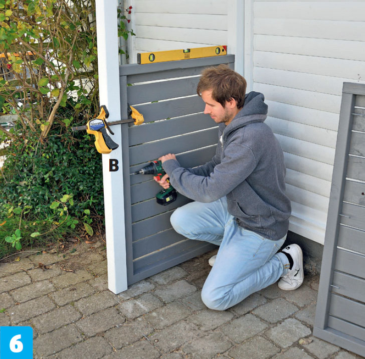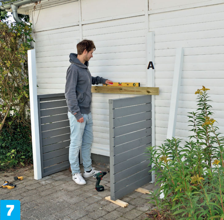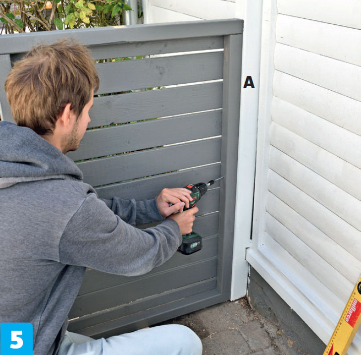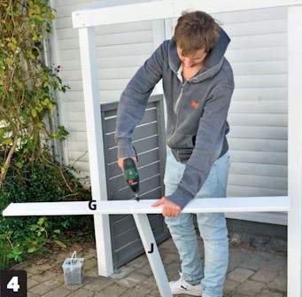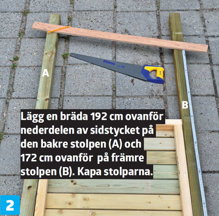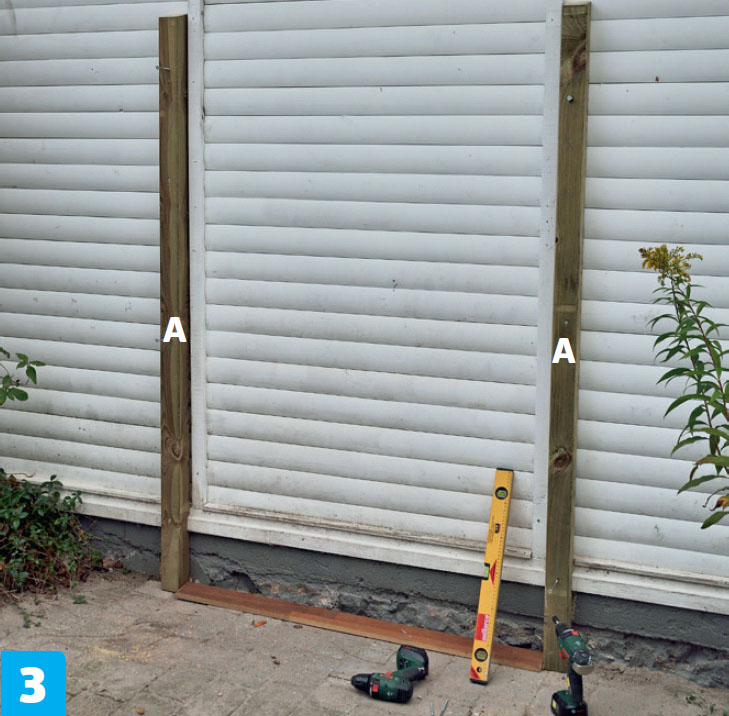 Klossa upp den andra sidoramen så att den är i våg med den första. Skruva därefter fast den i den bakre stolpen (A).