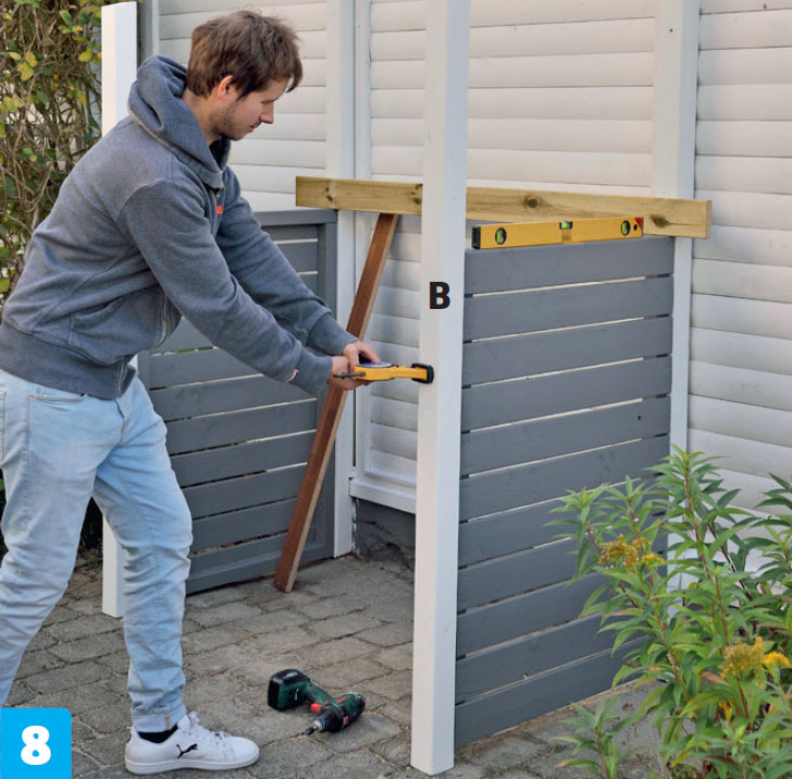 Skruva fast den främre stolpen (B). Håll ihop stolpen med sidoramen med en enhandstving och se till att sidan är i våg. Skruva därefter fast stolpen med 5,0 x 80 mm träskruv.