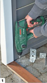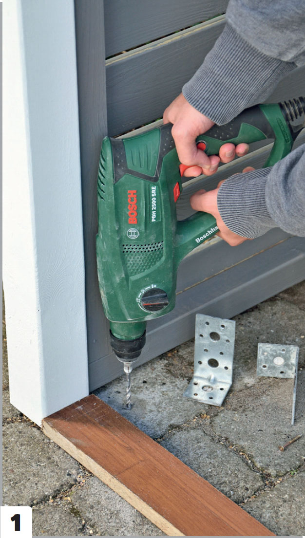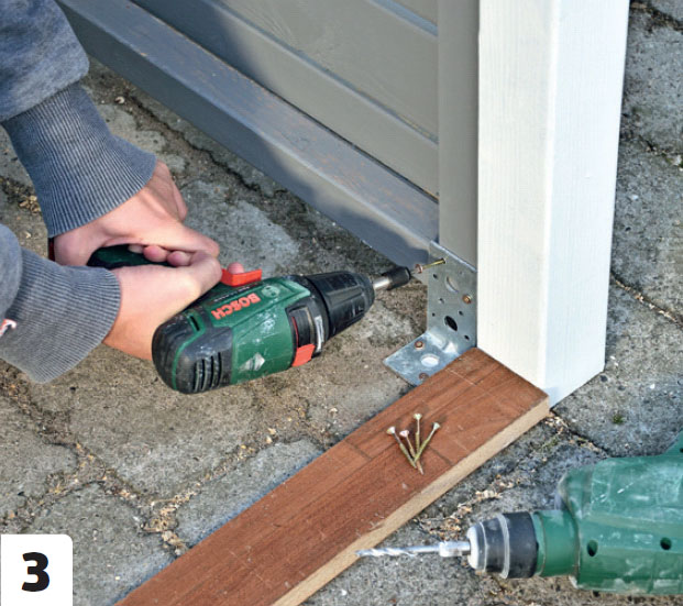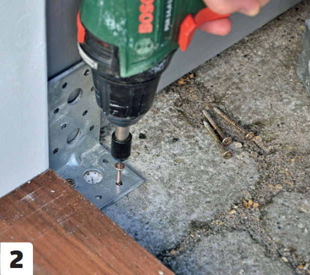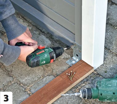 Metallvinklar fästs på skjulet och skruvas fast i plattorna, som det i förväg har borrats hål och satts plugg i.