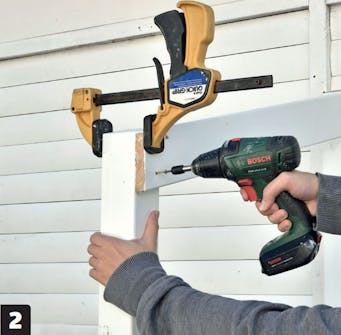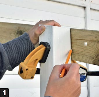Håll de lutande brädorna (H) på plats med en tving. Markera det sneda snittet och såga därefter av brädan så att framkanten fluktar med stolpen.