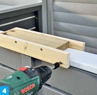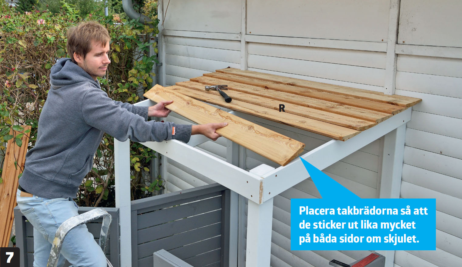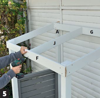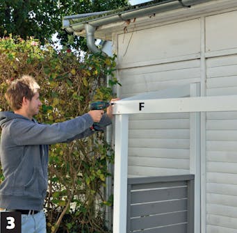 Skruva fast takfotsbrädan (F) på stolparna. Brädan ska sitta på framsidan av de främre stolparna och fästas med 4,0 x 50 mm skruv.