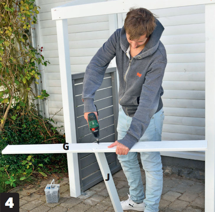 Såga till tvärslån (J). Tvärslån ska sitta mellan främre (F) och bakre takfot (G). Därför ska ändarna sågas i samma vinklar som sidobrädorna (H). Tvärslån skruvas (J) fast i den bakre takfoten (G) - på mitten.