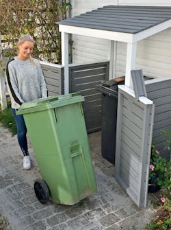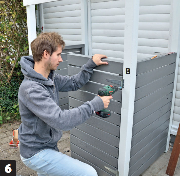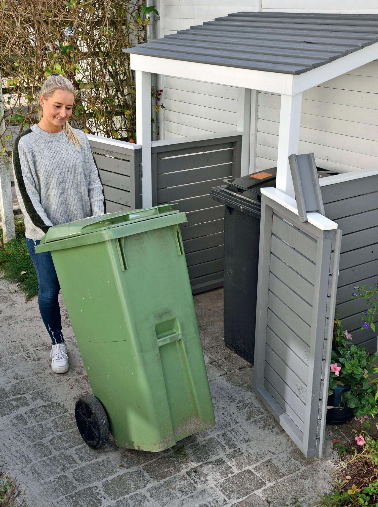 För att vara säker på att sopskjulet står stadigt och inte flyttar på sig när tunnorna rullas in och ut, fästs hela konstruktionen i plattorna undertill.