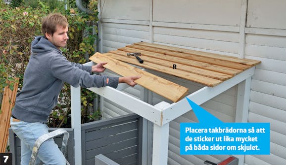 Det är dags att skydda skjulet uppåt. Därför byggs ett tak som läggs på en förstärkande ram högst upp runt de fyra stolparna.