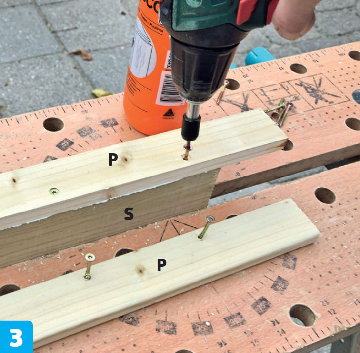 Låset består av två ribbor (P) och en skiva (S). Skruva och limma fast listerna på sidan av plywoodskivan med 4,0 x 40 mm skruv. Ribborna ska flukta med skivan i den ena änden.