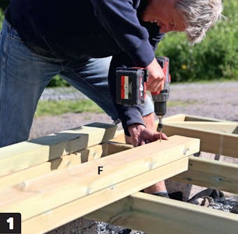Montera stagen (E) i hörnena. De ska användas som underlag till golvet. Såga till dem i ändarna med ett 45-graders snitt, och skruva fast dem med 5 x 90 mm skruv.