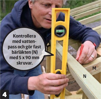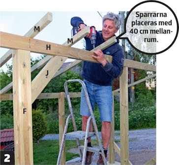 Skruva fast sparrarna (M) när du har kapat dem i ändarna med en kap-/geringssåg. Längden på sparrarna är anpassad, så att de passar till fem rader takpannor. Sparrarna görs fast med 5 x 90 mm skruvar.