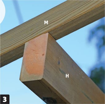 Mät upp för vinklade snitt överst på bärlinorna (H) och i änden av sparrarna (M). Lägg upp en sparre temporärt, och mät med smygvinkel. Bärlinorna kapas med cirkelsåg med vinklingsbar klinga.