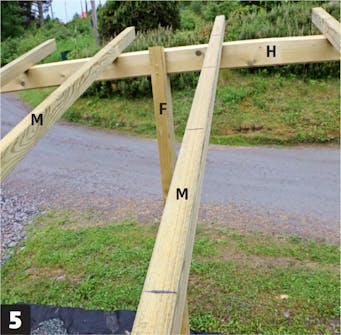 Hörnstolparna (F och G) görs av två reglar, som sammanfogas med 5 x 90 mm skruvar. Den ena regeln ska vara 10 cm kortare än den andra så att det blir ett hack i toppen som bärlinan (H) kan vila på.