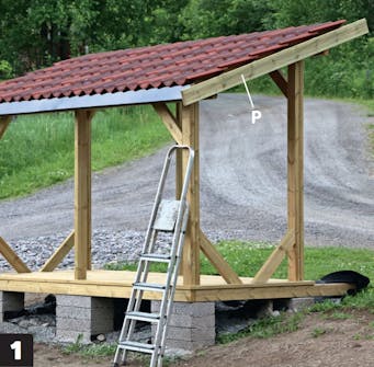 Passa in vindskivan (P) i fronten, så att brädorna passar mellan vindskivorna i sidan. Översta brädan sågas till med ett hack i varje sida och ett vinklat snitt (18 grader) i toppen, så att täckbrädan hamnar bra.