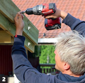 Skruva fast den översta vindskivebrädan (P) med 4,2 x 56 mm skruvar. Den placeras 4 cm ned på den första brädan, så att takpannorna täcks. Sätt ev. några hjälpklossar bak på brädan, så blir den lätt att sätta upp.