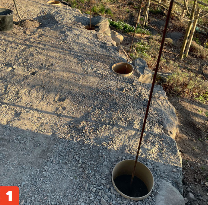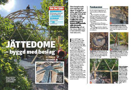 Börja med att gräva ut för plintarna. Domen ska stå på 20 stolpar. De ska stå med exakt lika stort avstånd runt en cirkel på Ø 11 meter. Hur noga du är här, märks senare.