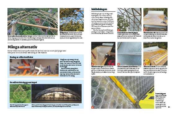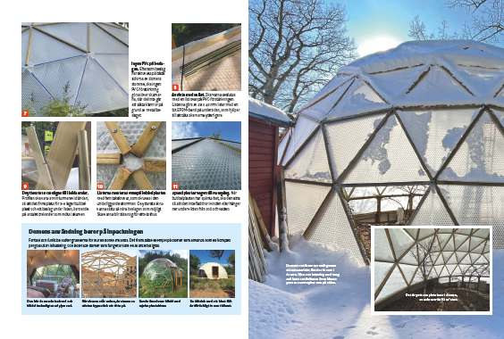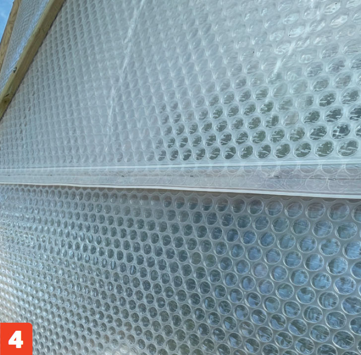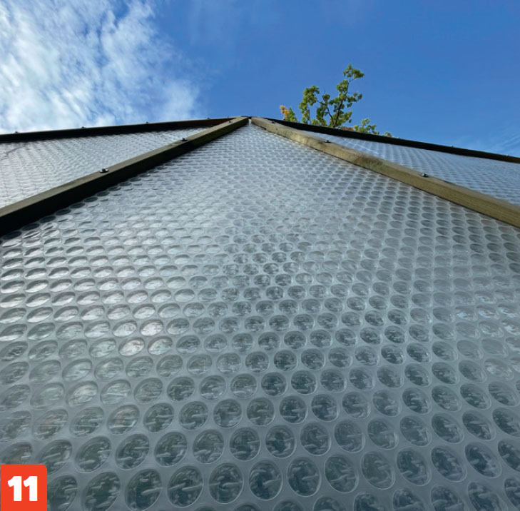 Domen kläs in en trekant åt gången. Inklädningen består av en kraftig bubbelplast, som isolerar växthuset lite. Materialet har dock främst valts för sin styrka.