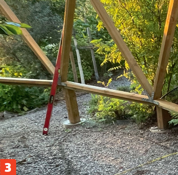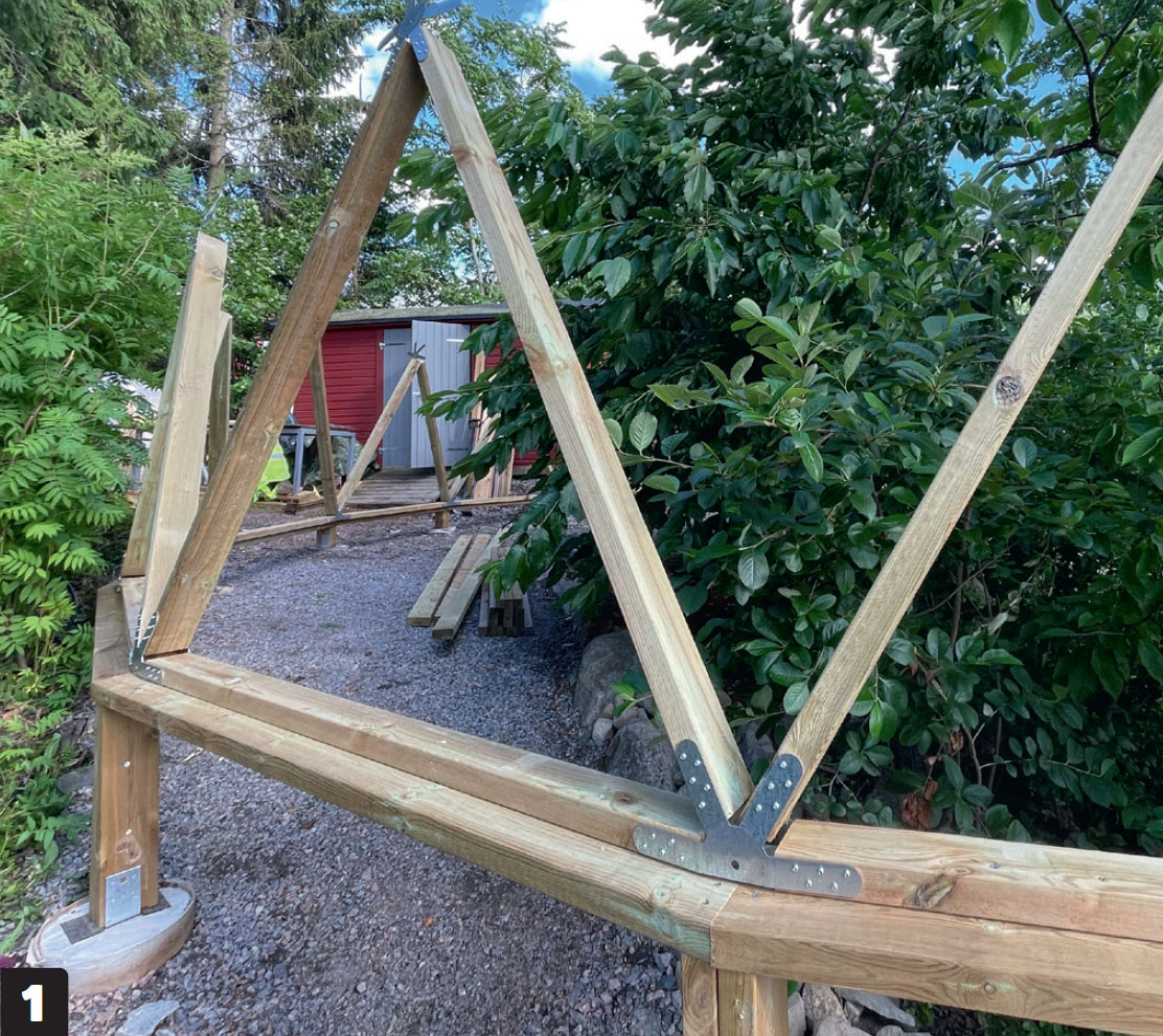Avsluta det andra lagret med vågräta reglar. När du gått ett varv runt syllen och det står trianglar längs kanten, är det dags att montera nästa vågräta lager, innan du fortsätter bygga uppåt.