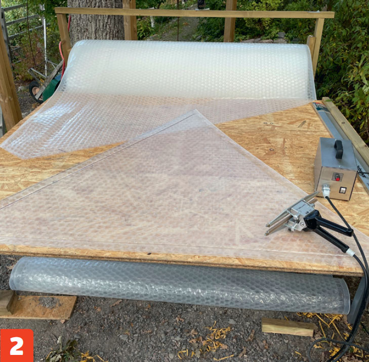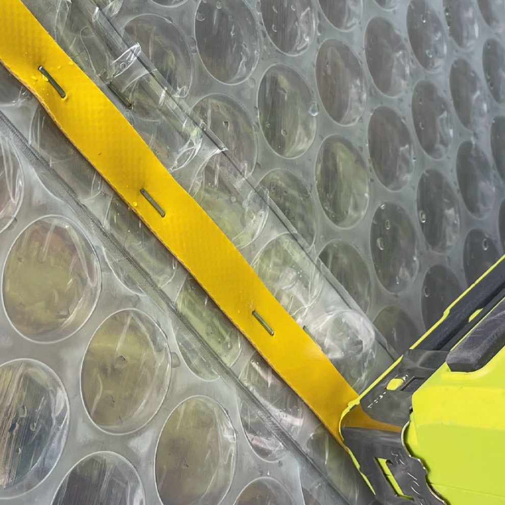 Inklädningen gör vi av ett slags rejäl bubbelplast, som vi köper på stora rullar. Plasten skärs i trekantiga fält och svetsas längs kanterna, så att det inte kan komma in vatten i bubblorna, och sedan monteras trekanterna först med häftklamrar genom ett stadigt PVC-band, så att klamrarna inte river igenom plasten.