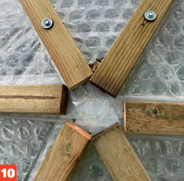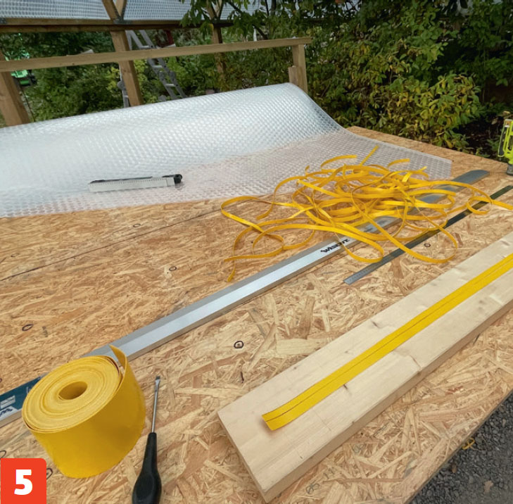 Listerna monteras ovanpå bubbelplasten med fem takskruvar, som skruvas i den underliggande stommen. De yttersta skruvarna sätts så nära beslagen som möjligt. Skarvarna blir täta nog för ett växthus.