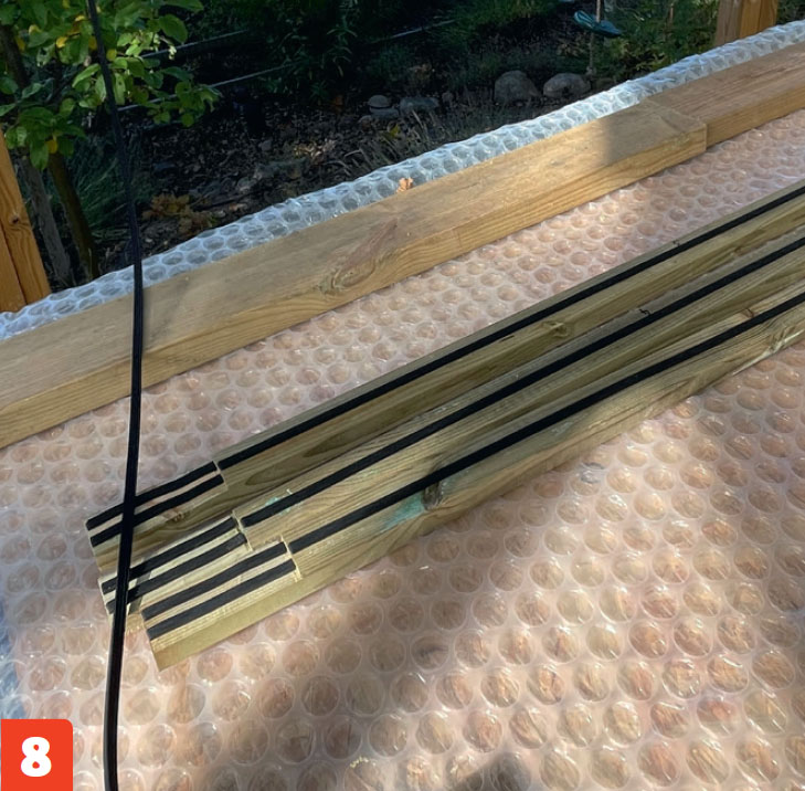 De yttersta 15 cm sågas till i båda ändar. Profilen ska vara 5 mm tunnare vid änden, så att det finns plats för 5-6 lager bubbelplast och ett beslag under listen, beroende på antalet trekanter som möts i skarven.