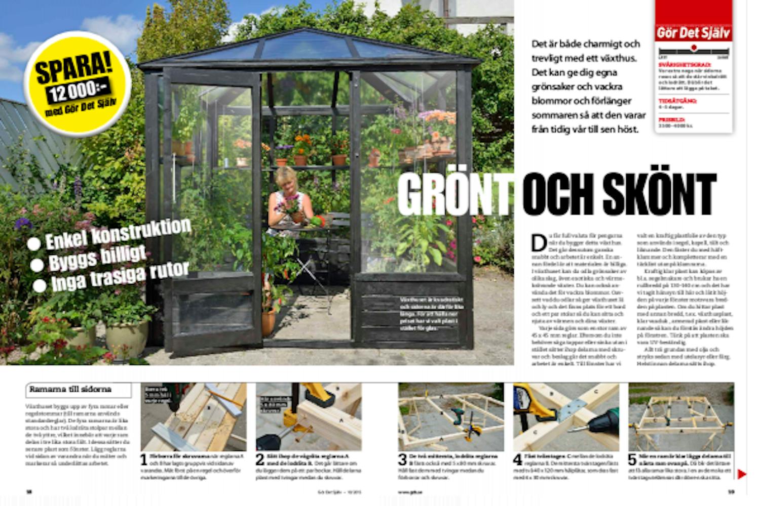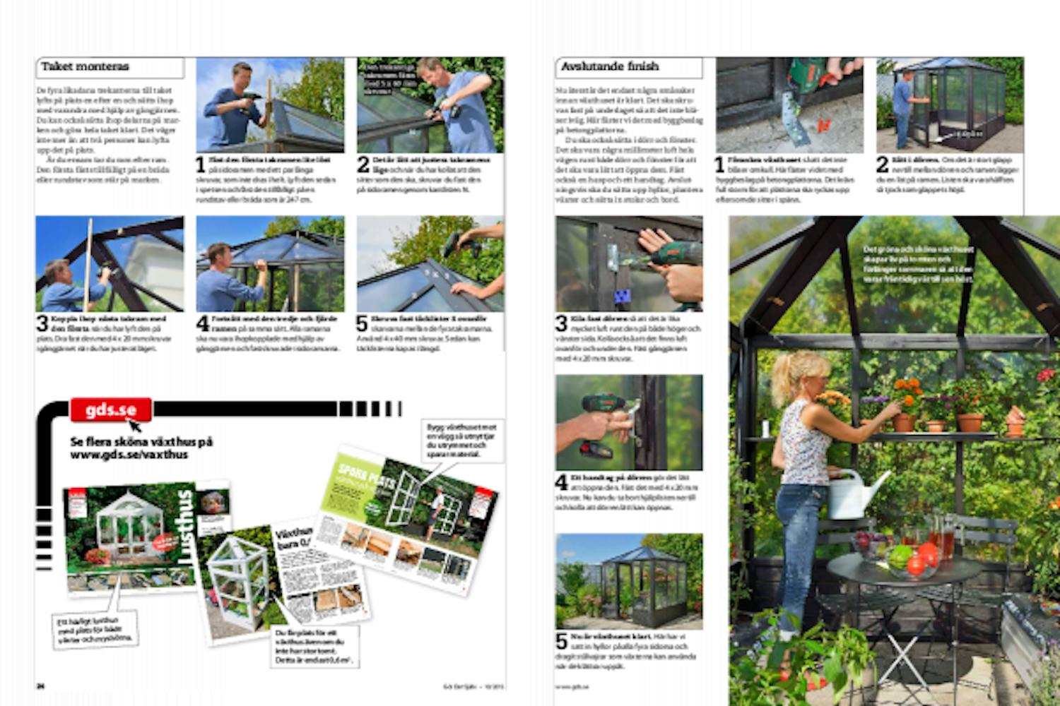Du ska också sätta i dörr och fönster. Det ska vara några millimeter luft hela vägen runt både dörr och fönster för att det ska vara lätt att öppna dem. Fäst också en hasp och ett handtag. Avslutningsvis ska du sätta upp hyllor, plantera växter och sätta in stolar och bord.