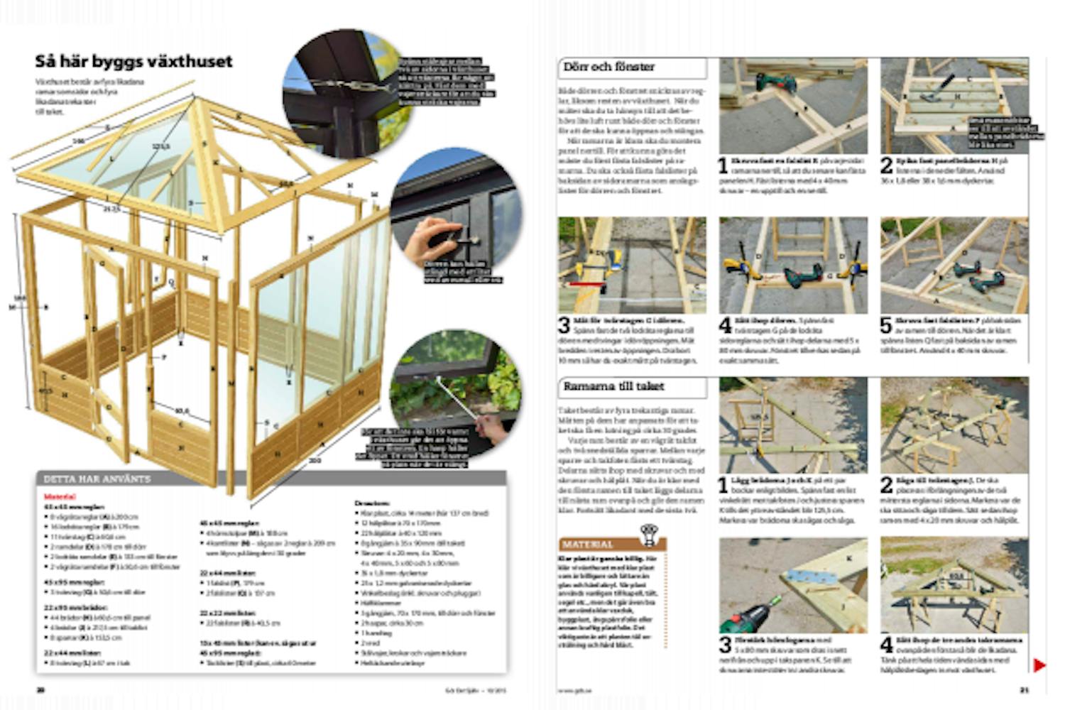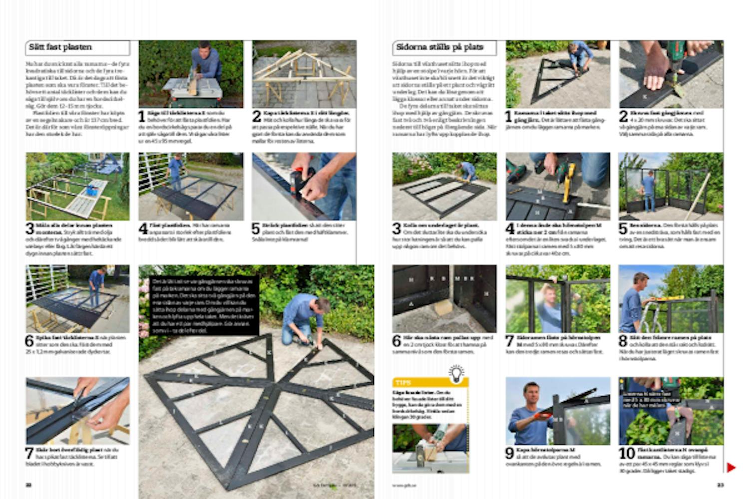 Nu har du snickrat alla ramarna - de fyra kvadratiska till sidorna och de fyra trekantiga till taket. Då är det dags att fästa plasten som ska vara fönster. Till det behövs ett antal täcklister och dem kan du såga till själv om du har en bordscirkelsåg. Gör dem 12-15 mm tjocka.