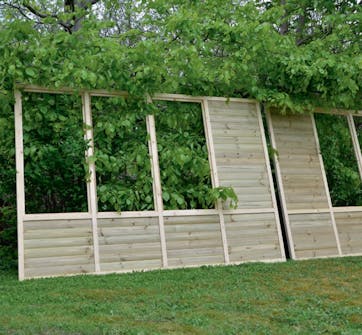 Sätt först upp den bakre gaveln. Skruva fast en lång hjälpbräda på sidan av ramen så att den stöttas tills övriga ramar har monterats. Ramen skruvas fast på plattformen med 5 x 80 mm skruvar på var 40:e centimeter.