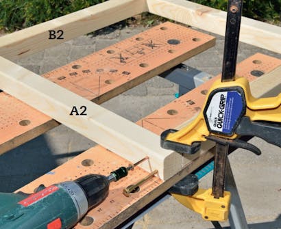 Markera placeringen på alla lodräta reglar B. Lägg den första regeln (den med markeringarna) på arbetsbänken och spänn ihop den med de övriga reglarna med tvingar. Överför sedan markeringarna med penna och vinkel.