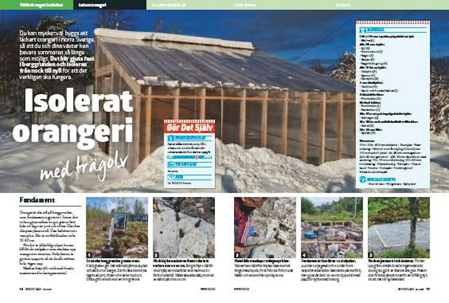 Orangeriet hålls uppe av en trästomme. Den är solitt byggd med många tättstående reglar. Väggarna monteras först i moduler, som sedan byggs ihop.