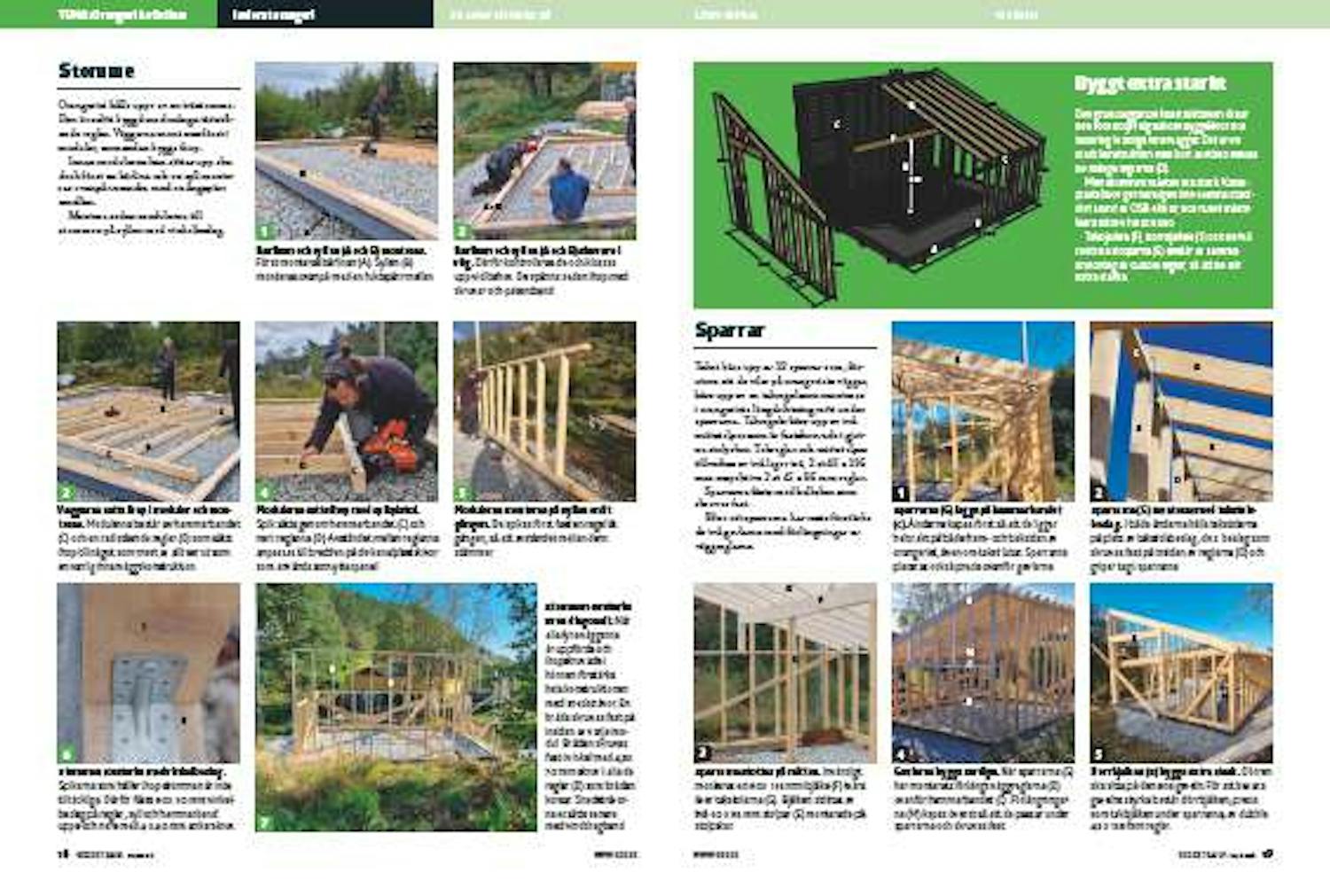 Stommen förstärks även diagonalt. När alla fyra väggarna är uppförda och ihopskruvade i hörnen förstärks hela konstruktionen med snedsträvor. En bräda skruvas fast på insidan av varje modul. Brädan skruvas fast i vinkel med 4,5 x 70 mm skruv i alla de reglar (D) som brädan korsar. Snedsträvorna ersätts senare med vinddragband.