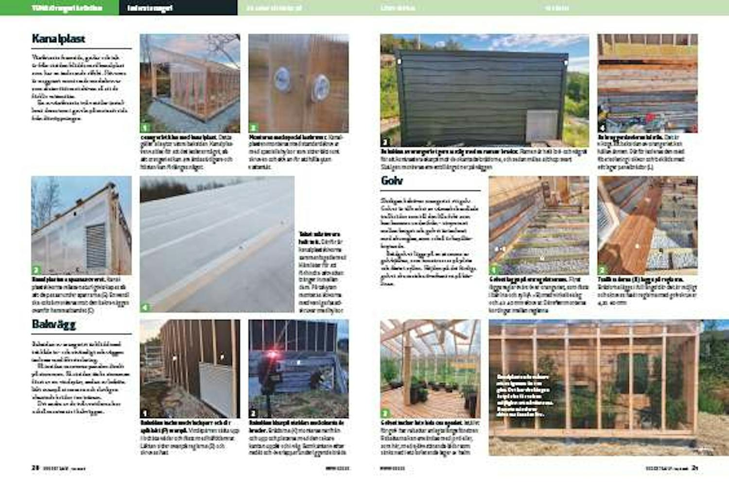 Orangeriet kläs med kanalplast. Detta gäller alla ytor utom baksidan. Kanalplasten valdes för att det isolerar något, så att orangeriet kan användas tidigare och hösten kan förlängas något.