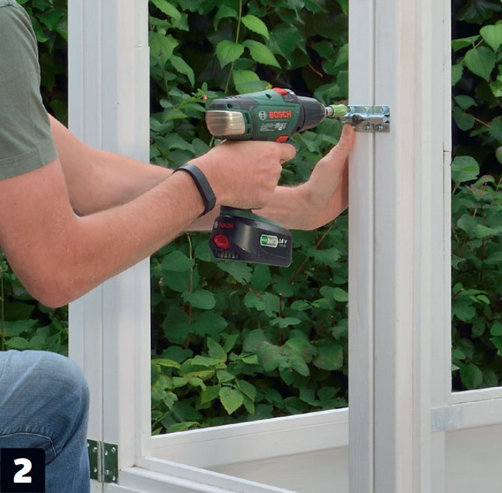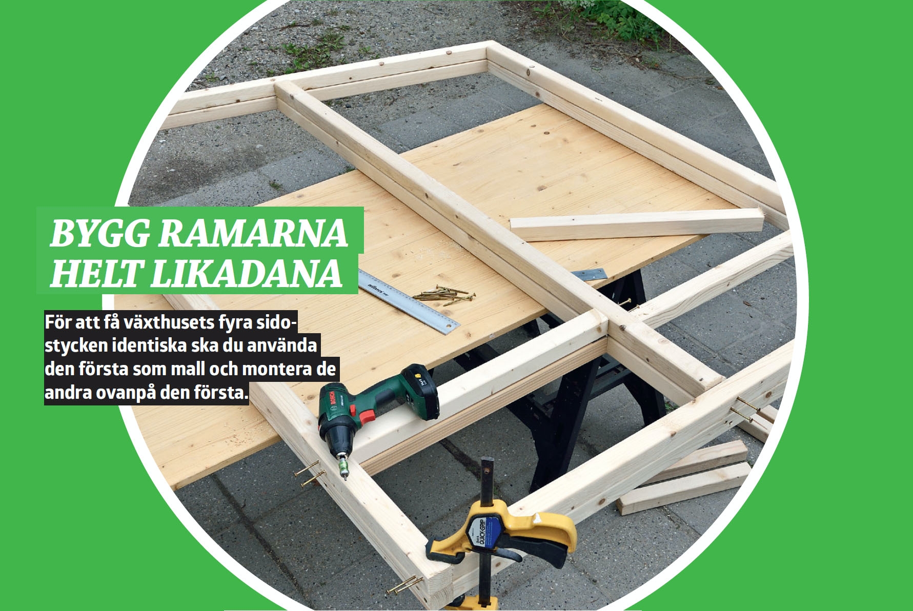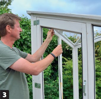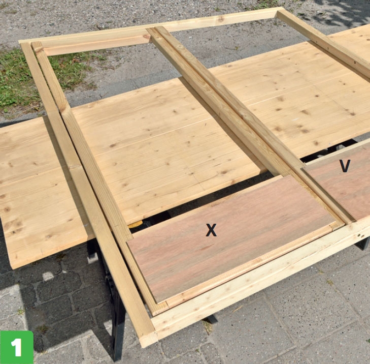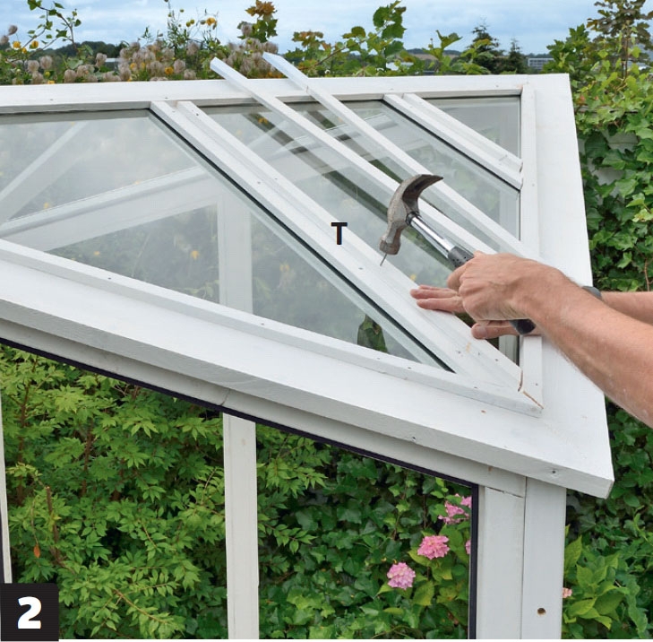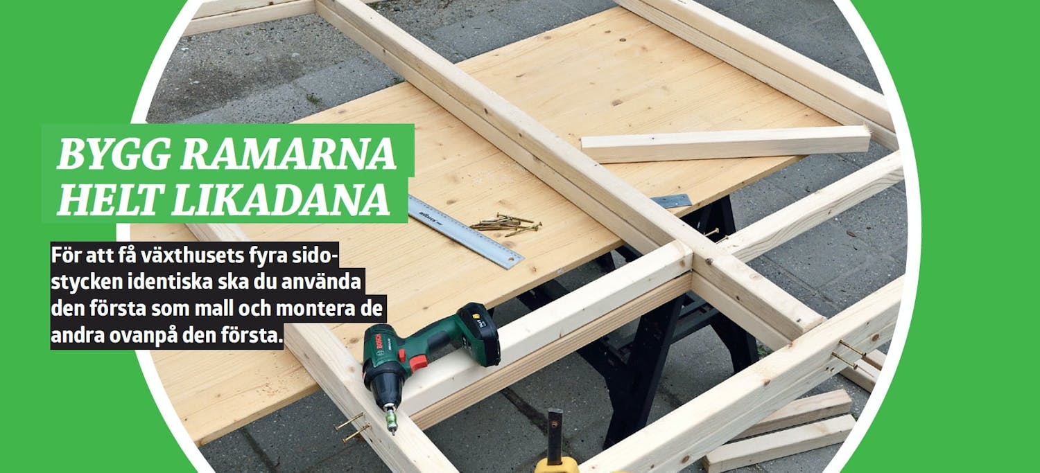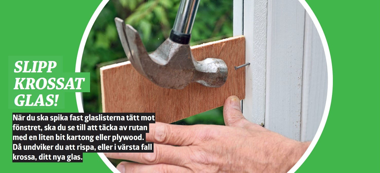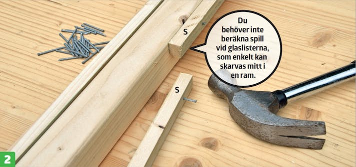 Skelettet är sammansatt och redo för att glaset ska sättas i, och listerna spikas på. Kontrollera måtten innan du beställer eller skär till glasen själv.