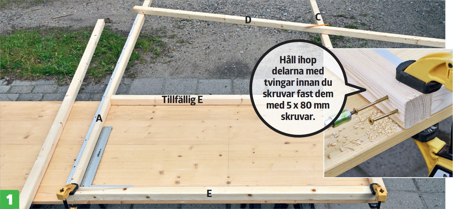 Sidostyckena tillverkas efter måtten på ritningen i materiallistan,. Ramarna är likadana, så börja med att bygga den första, och använd den sedan som mall för de övriga (även dörrkarmen). Innan du kapar reglarna ska du lägga ut alla delarna på en arbetsbänk, sätt ihop dem med skruvtvingar och placera eventuellt ett extra bottenstycke (Tillfällig E) i mitten av ramen mellan (A) och (C) för att stötta upp sidorna medan du sätter samman den första ramen. Rita upp var delarna ska kapas, och såga ut dem.