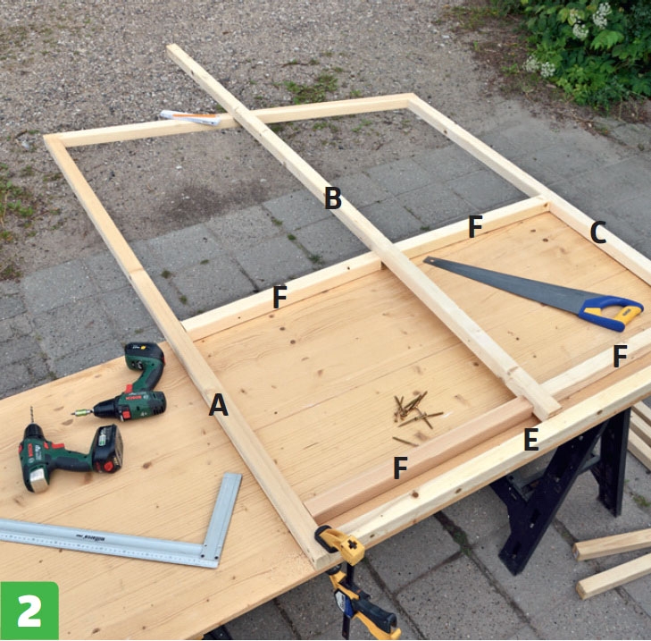 Gör fast mittregeln (B) och tvärstagen (F) med 5 x 80 mm skruvar genom ytterramen. I mitten görs de fast med en 40 x 120 mm spikplatta, som skruvas fast med små 4 x 20 mm skruvar. Bygg nu de resterande ramarna.