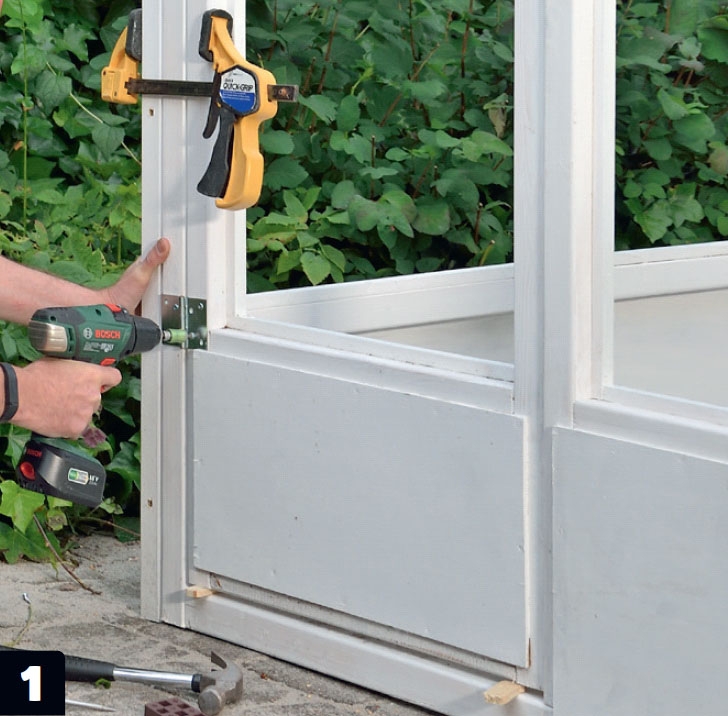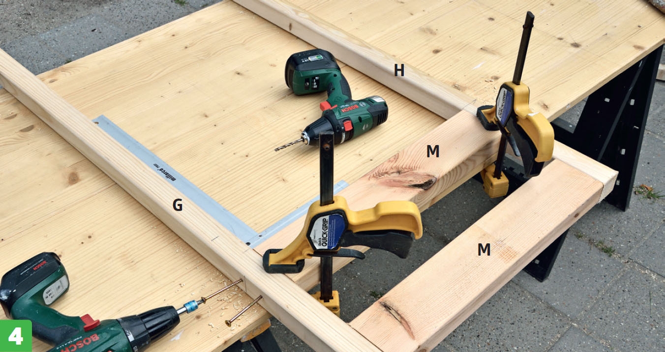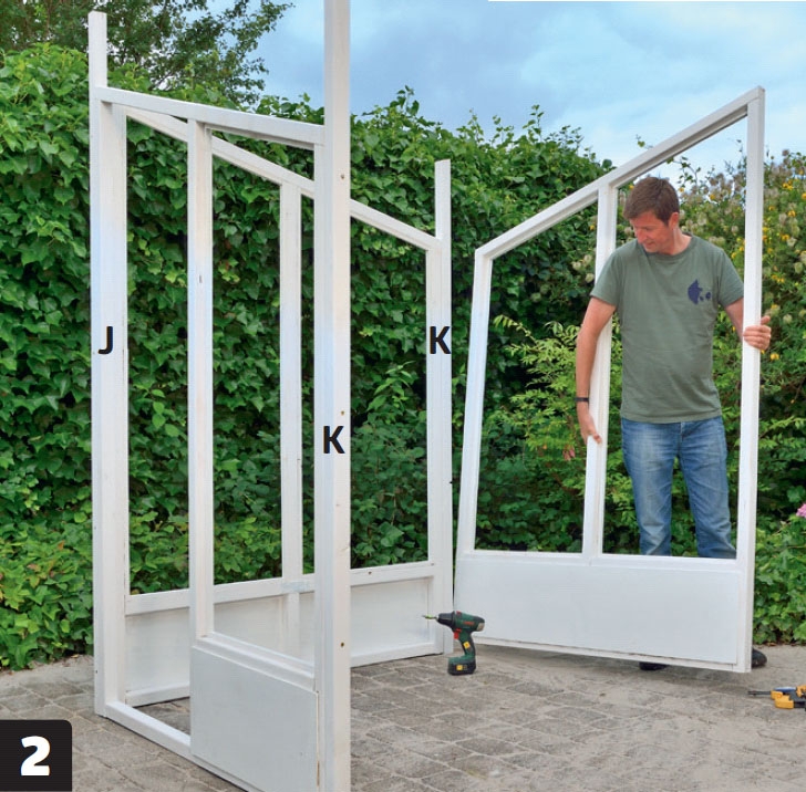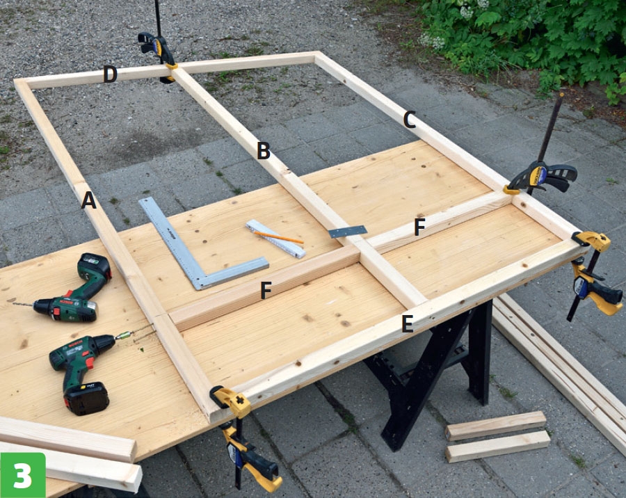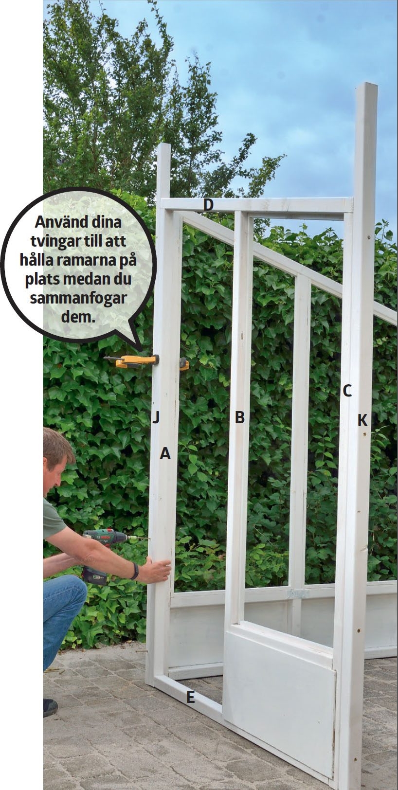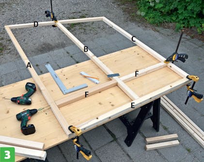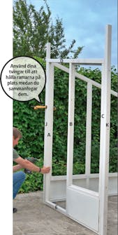När du har byggt ihop de tre sidoramarna och dörrkarmen, ska du till sist bygga själva dörren. Såga ut delarna till dörren (L, G, H och M), och gör fast dem med 5 x 80 mm skruvar. Även här är det lättast att styra om du håller fast delarna med skruvtvingar innan du skruvar ihop dem. Se till att löpande kontrollera att dörren är vinkelrät och passar in i dörrkarmen.