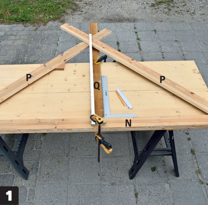 Fixera brädor och stag (N, P, Q og R) med skruvtvingar efter måtten på ritningen i materiallistan, och markera hur de ska kapas. Såga sedan ut brädorna. Du kan se (R)-stagen i nästa steg.