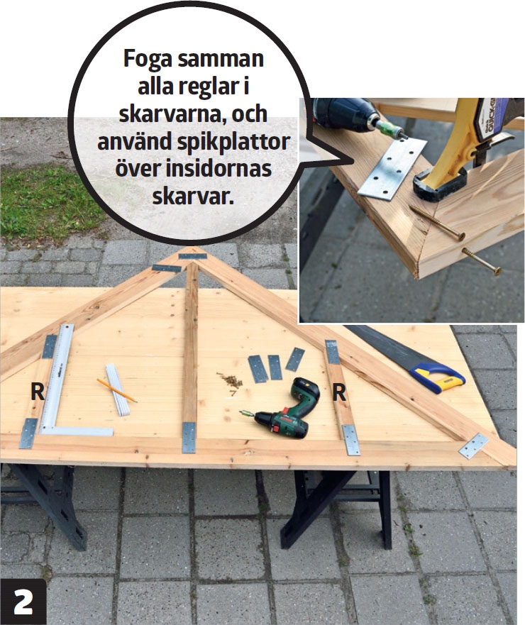 När du har byggt de fyra sidoramarna ska du bygga två takramar. Och som du kan se på bilderna och ritningarna, är de båda trekantiga. Precis som med sidoramarna är det en god idé att bygga dem ovanpå varandra, för att få dem helt identiska.