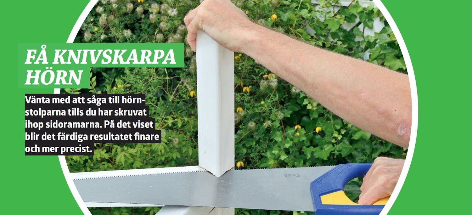 Det är dags att såga till hörnstolparna, och du ska bara såga stolparna i ett snitt, som linjerar med sidoramarna.
