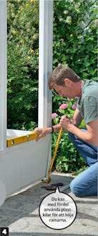 Det sista vi gör innan glaset sätts i, är att montera dörren i dörrkarmen. Här ska dörren pallas upp, så att den sitter precis mitt i ramen, och se till att lika det är mycket luft runt om.