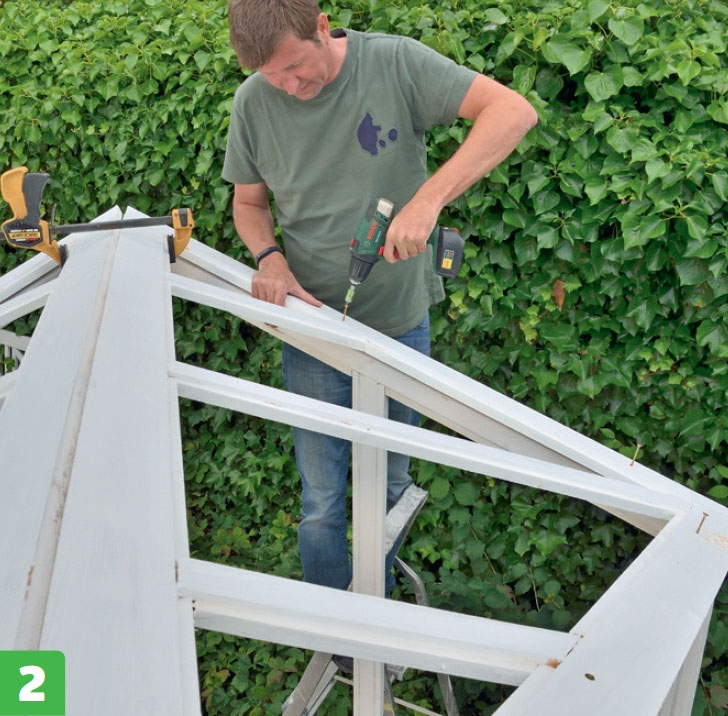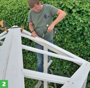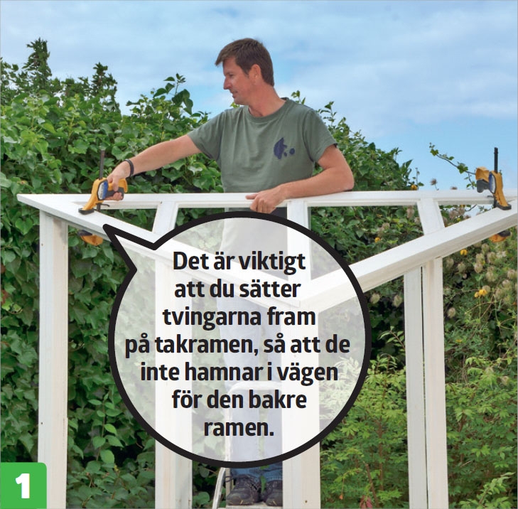 Spänn fast den främre takramen på sidoramarna med ett par skruvtvingar - takramen ska senare kunna öppnas och stängas, och ska därför inte skruvas fast i sidoramarna med skruvar.