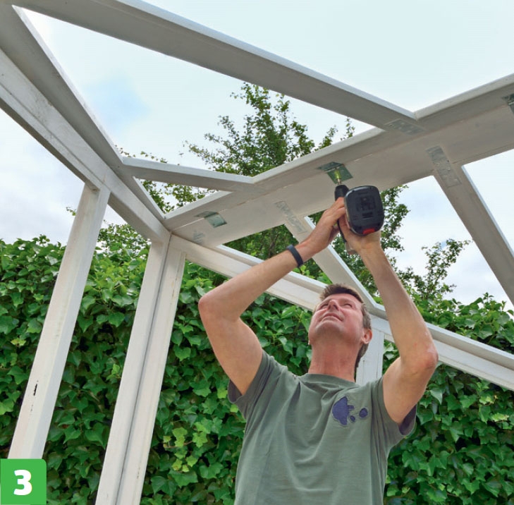 Lägg den bakersta takramen på plats, och skruva fast den i sidoramarna med tre skruvar, 5 x 50 mm, i varje sida av trekanten.