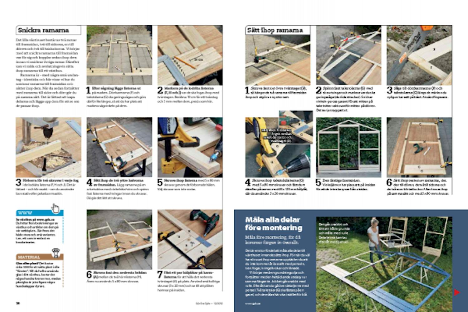 Det lilla växthuset består av två ramar till framsidan, två till sidorna, en till dörren och två till takluckorna. Vi börjar med att snickra ramarna till framsidan var för sig och kopplar sedan ihop dem innan vi snickrar övriga ramar. Därefter kan vi måla och avslutningsvis sätta ihop ramarna till ett växthus.