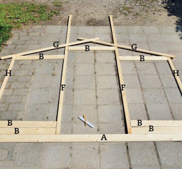Efter sågning läggs listerna ut på marken. Dörrkarmarna (F) och takstolarna (G) ska geringssågas och görs därför lite längre, så att du har plats att markera sågvinkeln på dem.