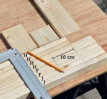 Markera på de lodräta listerna (F, H och J) var de ska fogas ihop med tvärstagen. Beräkna 10 cm för ett tvärstag och 5 mm mellan dem, precis som här.
