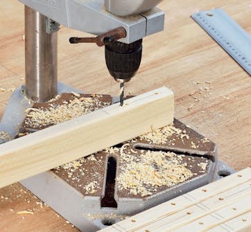 Förborra för två skruvar i varje fog i de lodräta listerna (F, H och J). Det är lättast - och blir exakt - om du använder borrstativ eller pelarborrmaskin.