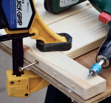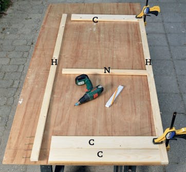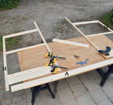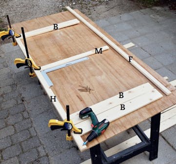 Sätt ihop de två yttre halvorna av framsidan. Lägg ramarna på en arbetsskiva med vinkelräta hörn och spänn fast listerna med tvingar innan du skruvar. Då går det lätt att skruva.