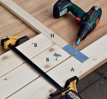 Skruva fast den nedersta brädan (A) mellan de två hörnlisterna (H). Även nu används 5 x 80 mm skruvar.
