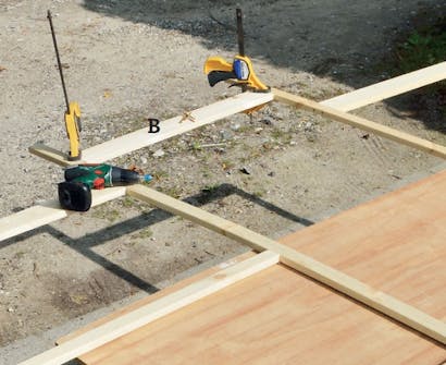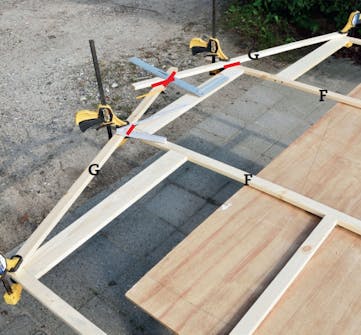 Spänn fast takstolarna (G) med skruvtvingar och markera var du ska geringssåga (de röda strecken). Snickarvinkeln ger oss garanti för att mitten på taket sitter rakt ovanför mitten på dörren. Det ser ju snyggast ut.