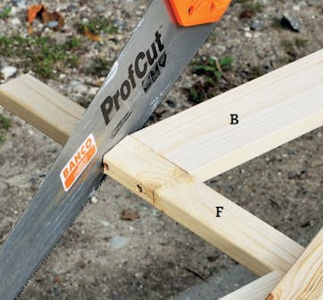 Såga till dörrkarmarna (F) och takstolarna (G) längs de märken du nyligen har satt på träet. Använd fogsvans.