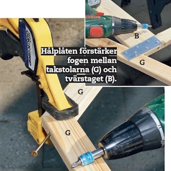 Skruva ihop takstolslisterna (G) med 5 x 80 mm skruvar och fäst dem därefter på ramen med 40 x 120 mm hålplåt, där du använder 3 x 20 mm skruvar.