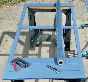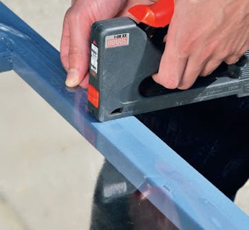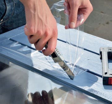 Sträck plasten och fäst den. Snåla inte med häftklamrarna. De döljs ju senare av täcklister, så de kommer inte att synas när växthuset är klart.