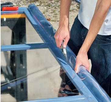 I stället för att använda både tungt och dyrt glas eller plexiglas har vi valt klar plast till alla fönster. Det är den slags plast som används till fönster i tält och i segel, och utöver att vara stark och seg så är den glasklar och tål solstrålning.