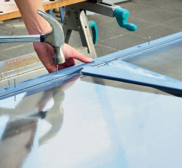Lyft upp den ena takluckan och lägg den på plats så att sidorna hamnar kant i kant med takstolarna. Du ska börja med den lucka som senare inte ska öppnas.
